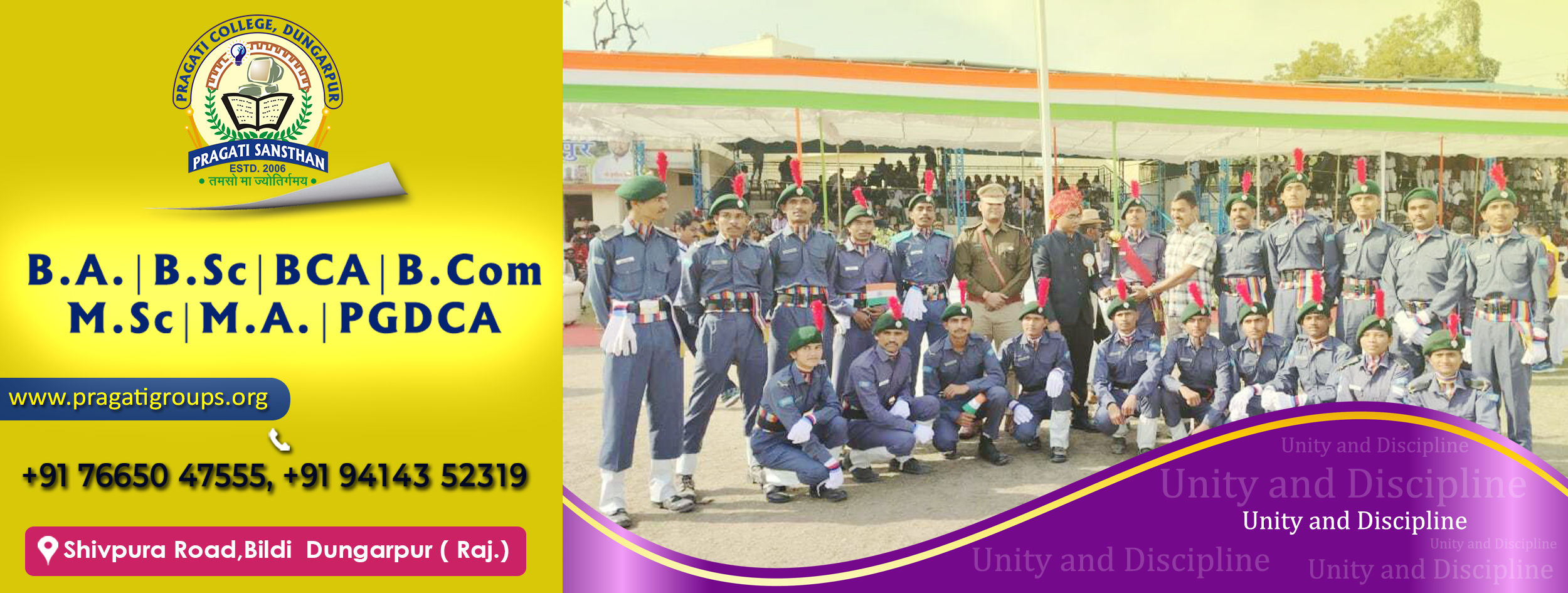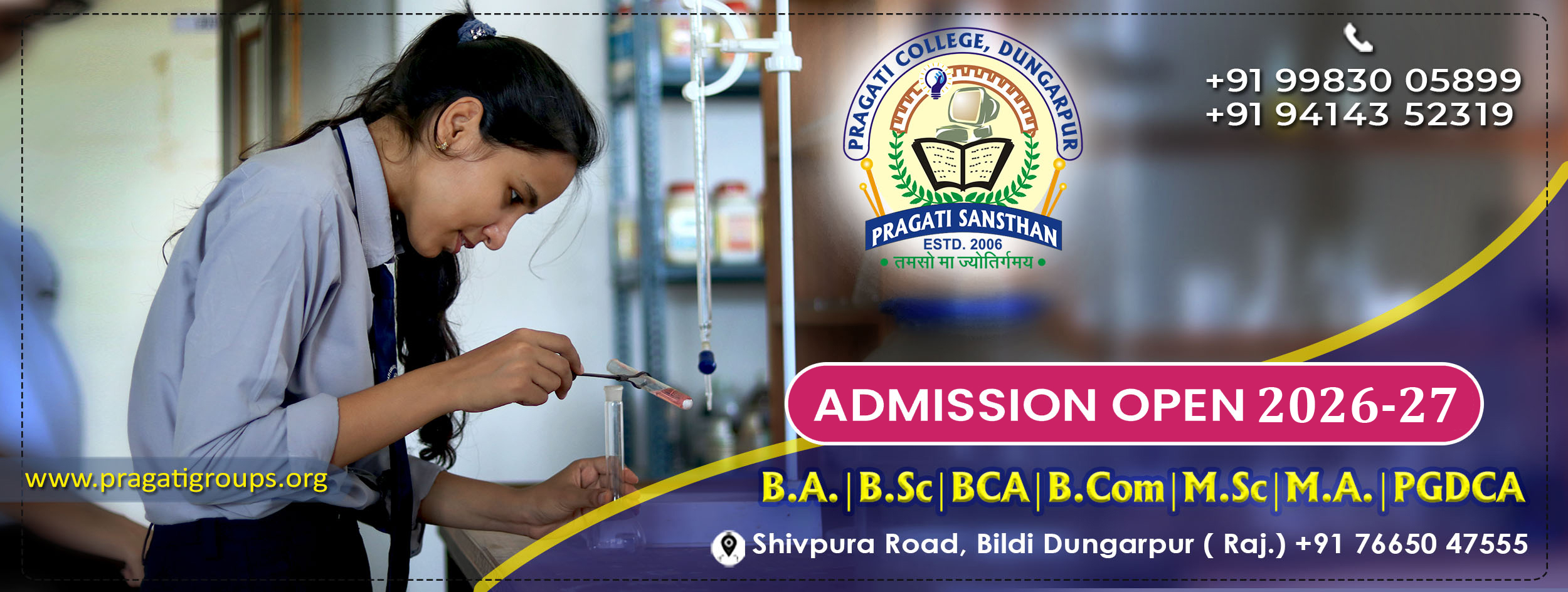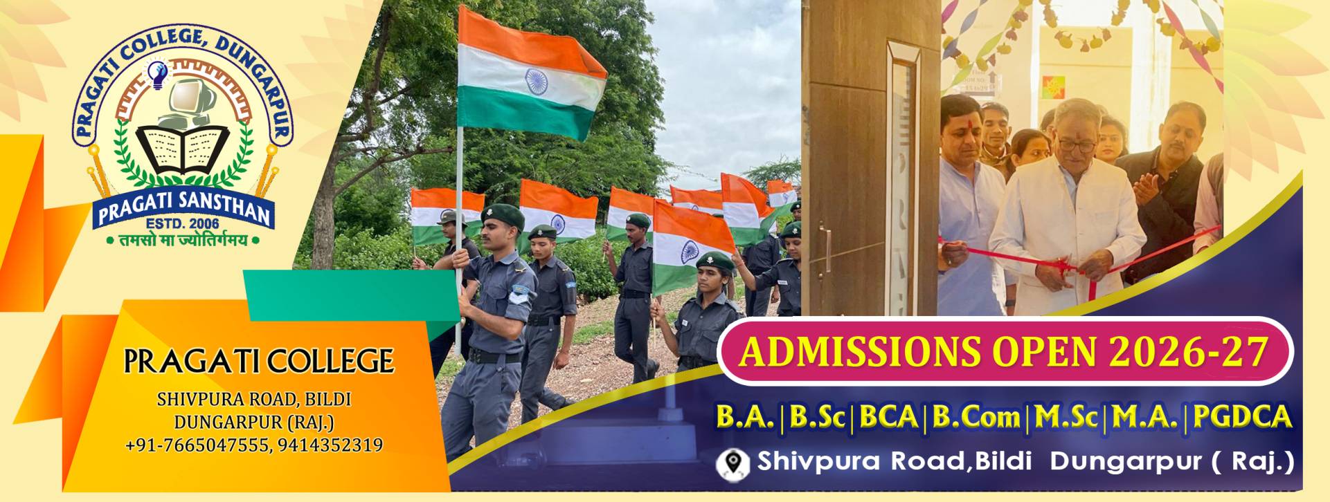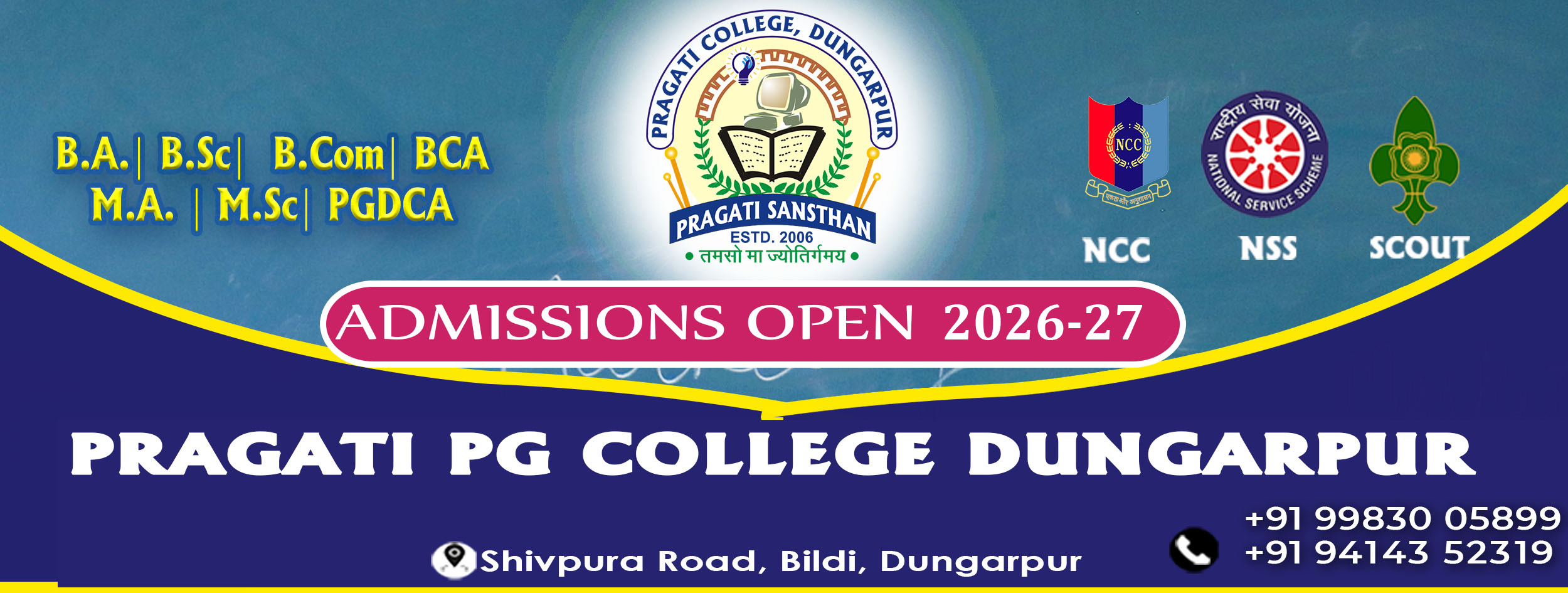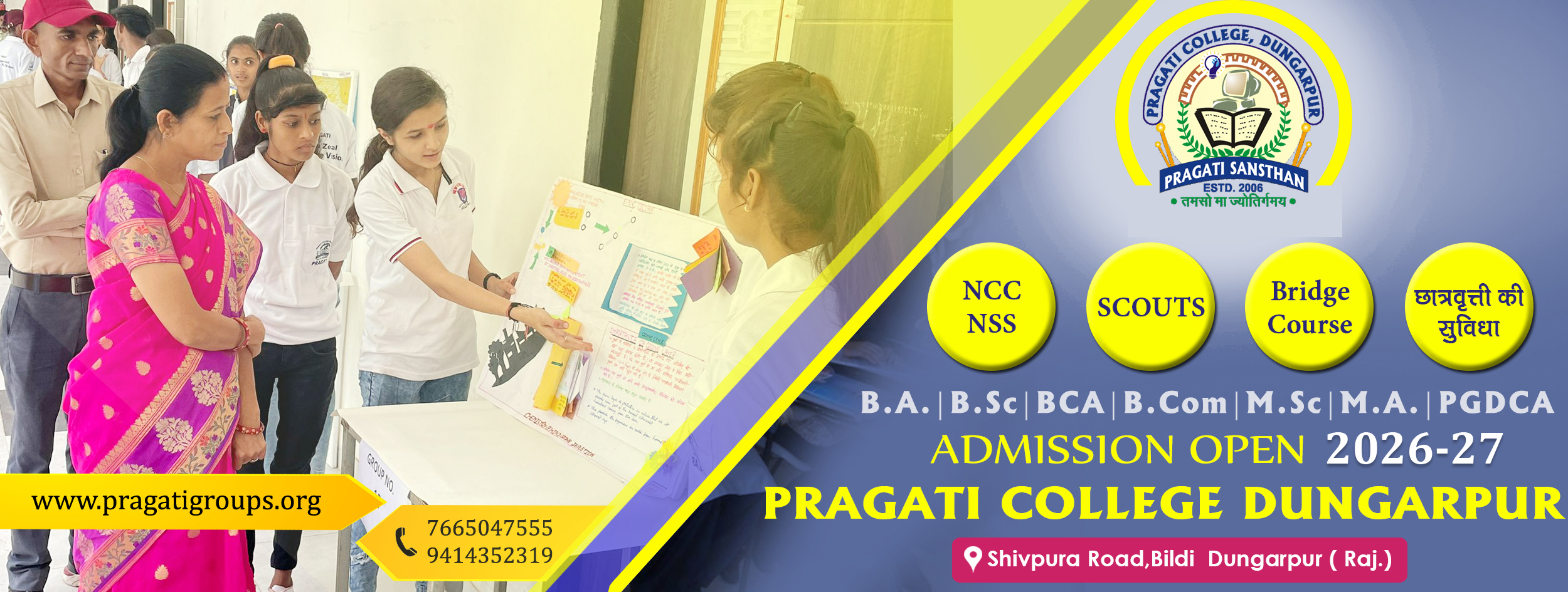 Pragati Sansthan is one of the Best in Dungarpur which was established on 17th March 2004 by Mr. Prashant Choubisa. Pragati College was established in Dungarpur as the first Private College in 2006. B.A., M.A., B.Sc. (Biology, Maths & Computer Science), M.Sc. (Chemistry, Zoology), BCA, PGDCA. B.Com. and M.Com. Courses are available for study. & Shiv Narayan Choubisa College Simalwara was established in the Year 2005. B.A., B.Sc. and M.A. Courses are available for study in SNC simalwara College. At Pragati Sansthan, we are committed to providing a holistic educational experience that equips our students with the skills and knowledge needed to succeed in today’s rapidly changing world.